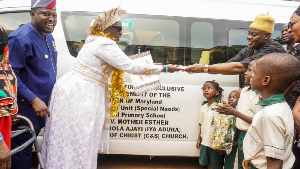 Exactly one week after she toured public primary schools across Lagos Mainland and Kosofe after her visit to LASUBEB to felicitate with her Protegee Hon Dayo Israel who was appointed Permanent Board Member LASUBEB, the Global Philanthropist Rev Esther Ajayi has delivered a brand new bus to the Inclusive Unit (Special Needs School) at Maryland Primary School.
