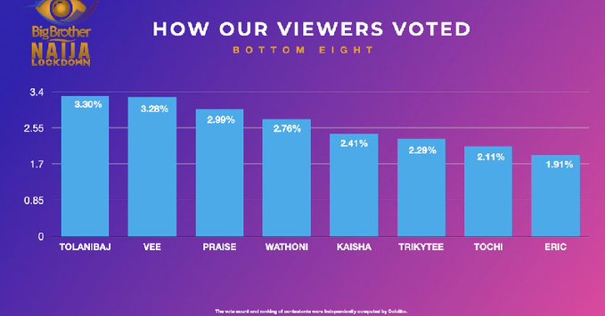 In the Sunday night eviction show which saw four housemates, Eric, Tochi, Kaisha and Trikytee in the least voted category.