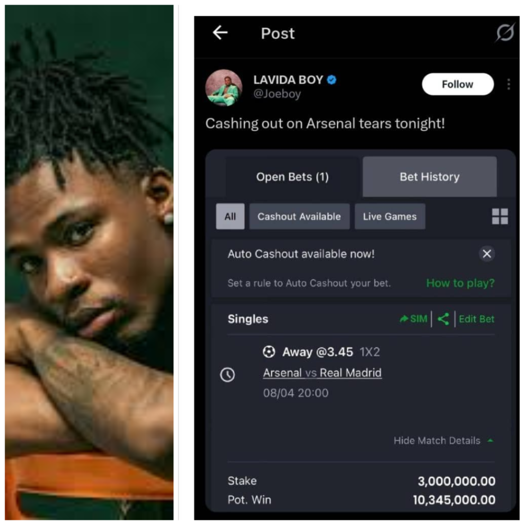 Nigerian Afrobeats sensation Joeboy is licking his wounds after a high-stakes gamble went wrong during Tuesday night’s UEFA Champions League quarter-final. The music star placed a ₦3 million bet on Real Madrid to win, anticipating a payout of over ₦10 million. He shared the betslip earlier with the caption, “Cashing out big on Arsenal tonight.”
