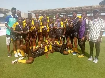 Ayisat Yusuf Football Academy players and officials celebrating with their trophy and medals after winning the inaugural RAAF Lagos Female Unity Cup.