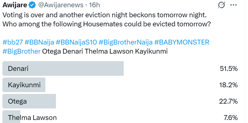 Other housemates who consistently appear at the bottom of the unofficial polls include Otega, Thelma Lawson, Kayikunmi, and Doris. Depending on Big Brother’s decision about how many contestants will be evicted this week, any one of these names could be shown the door.